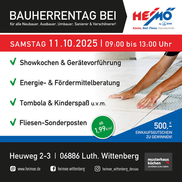 Mit Showkochen und Gerätevorführung, Tombola und Kinderspaß, mit großem Fliesen-Sonderpostenverkauf ab 1,99€/QM und allem zu Wärmepumpen & Co.! Gewinnen Sie außerdem einen 500 Euro-Einkaufsgutschein!