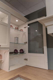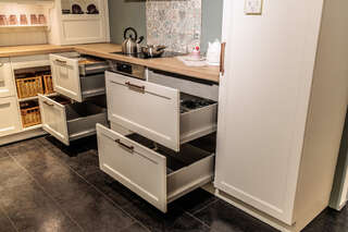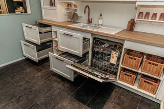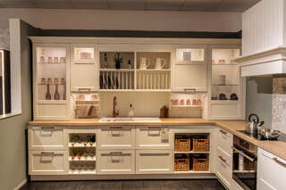 Diese hochwertige Ausstellungsküche in L-Form von Häcker Küchen (concept 130) vereint traditionelle Gemütlichkeit mit zeitgemäßem Komfort.