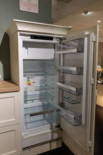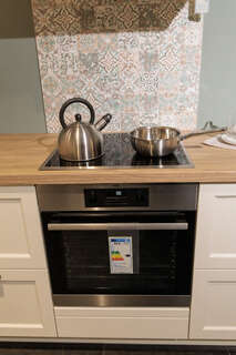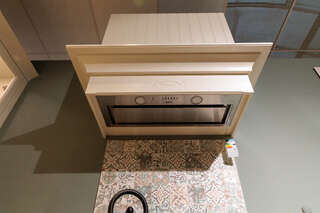 Induktionskochfeld mit Bräterzone und Hob²Hood, Lüfterbaustein im Landhauskamin (Hob²Hood), Einbaubackofen, vollintegrierter Geschirrspüler sowie Kühlschrank für die 123er Nische – alles bereits enthalten.
