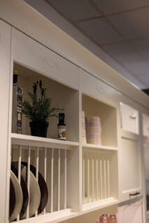 Echtholzfurnierte Fronten in Bristol Weiß, eine 40 mm Arbeitsplatte im Butcherblock-Dekor Natur und antik-kupferfarbene Griffe sorgen für eine warme, stilvolle Ausstrahlung. Beleuchtete Schränke setzen die Küche stimmungsvoll in Szene und bieten zugleich angenehmes Arbeitslicht. Großzügige Stauraumlösungen halten alles ordentlich und griffbereit.